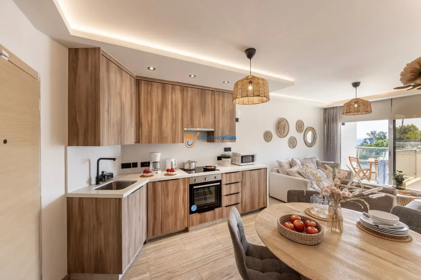 The apartment offers comfy and spacious open plan living with a fully equipped kitchen, dining area with table and chairs, comfy sofa which opens out into a sofa bed and patio doors leading out on to a balcony.