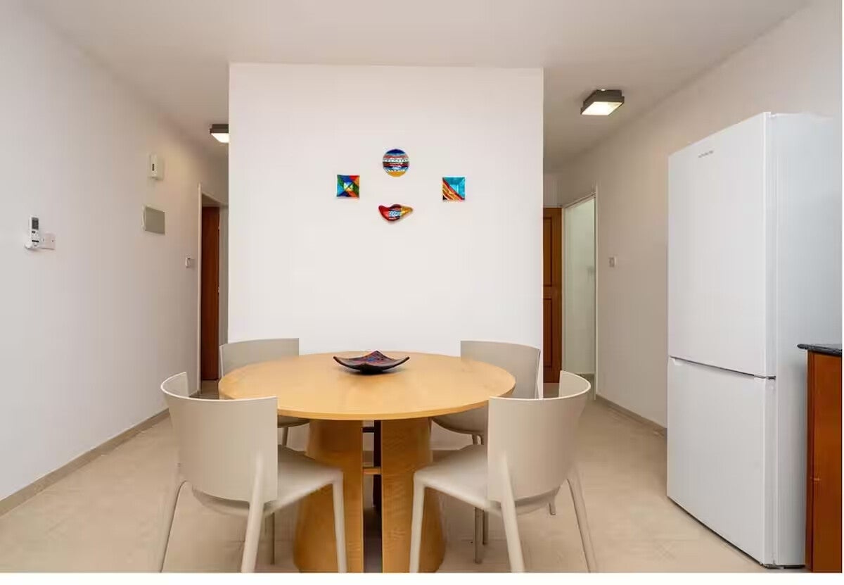 Coming on the front door you enter into the fully modernised and equipped kitchen with a dining table and 4 chairs, that leads through to the open partitioned living area, with large corner sofa, and patio doors leading out onto the balcony with dining table and chairs for al fresco dining.